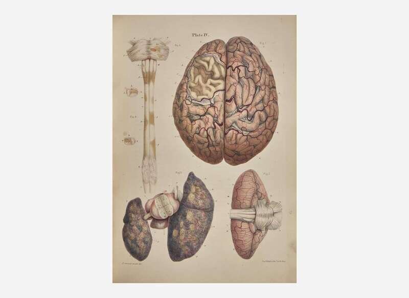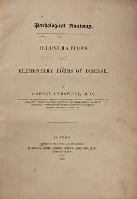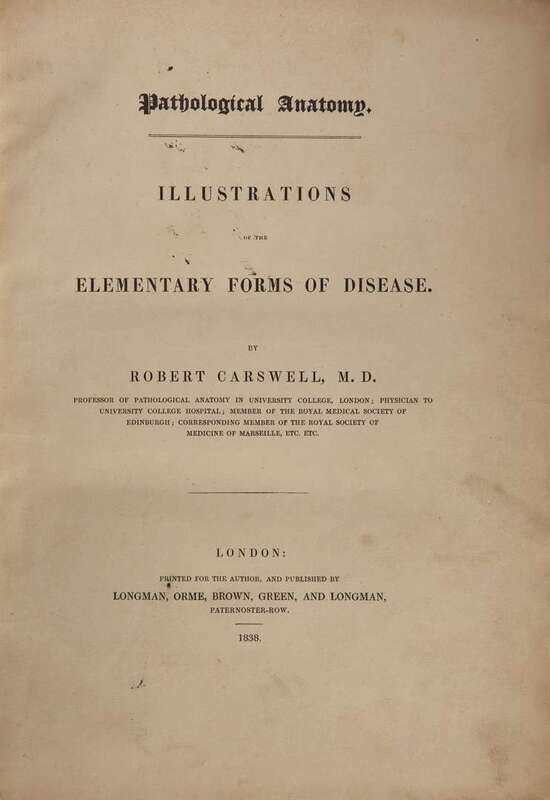 First edition of “one of the finest pathological atlases ever produced” (Heirs to Hippocrates). Carswell was professor of pathological anatomy at University College, London, and physician at the University College hospital when he was commissioned to make a series of pathological drawings. As Carswell explains in the present volume's Notice, he undertook the project to ease "the great difficulty, and frequently the impossibility, of comprehending even the best descriptions of the physical or anatomical characters of diseases, without the aid of coloured delineations." In the process, between 1828-31, he executed over 2,000 watercolors of diseased structures, of which 48 were chosen for this publication, and transferred to stone by Carswell himself. Commenting on the illustrations, noted physician William Osler wrote, they “have, for artistic merit and for fidelity, never been surpassed, while the matter represents the highest point which the science of morbid anatomy had reached before the introduction of the microscope." (Bibliotheca Osleriana). The work was originally issued in twelve parts, each with four hand-colored lithographs, with each part representing different pathological states, such as Inflammation, Analogous tissues, Atrophy, Hypertrophy, Pus, Mortification, Hemorrhage, Softening, Melanoma, Carcinoma (in two parts, with two sets of plates) and Tubercle.