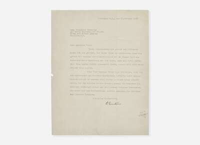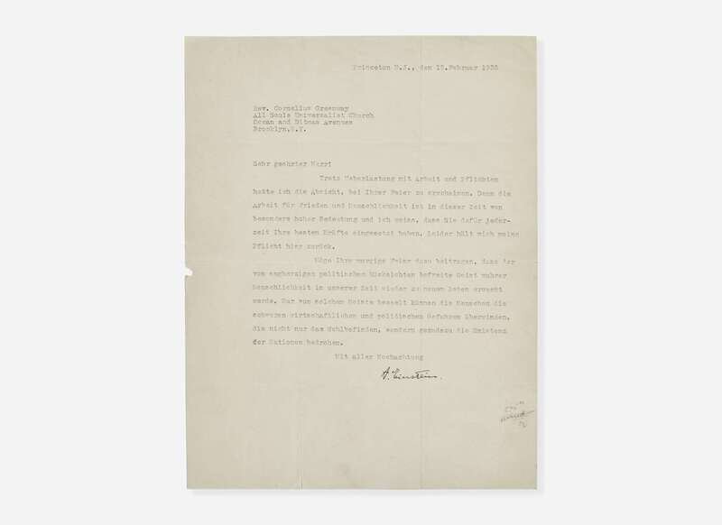 Princeton, New Jersey, February 15, 1935. Single sheet, 11 x 8 1/2 in. (279 x 216 mm). One-page typed letter in German, signed by Albert Einstein to Reverend of Brooklyn's All Souls Universalist Church and autograph collector, Cornelius Greenway, informing him that he will not be able to attend a celebration at the Church, but praising him for his work. Creasing from contemporary folds, small tear in center left edge.