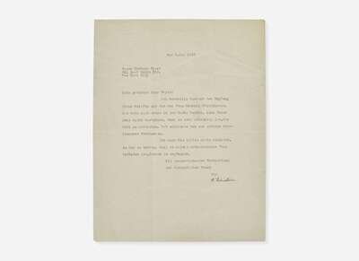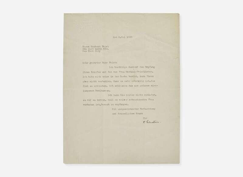 Princeton, New Jersey, May 2, 1936. Single sheet, 10 15/16 x 8 1/2 in. (278 x 216 mm). One-page typed letter in German on Einstein's Princeton home stationery, signed by him to Herbert Feist: “Dear Mr. Feist, I gratefully acknowledge receipt of your letter and that of Ms. Macholl-Friedlander. I have already tried to do this, but I cannot hide from you the fact that it is very difficult to achieve the goal. I conclude this from other failed efforts. Unfortunately, I cannot invite you to come to me because my seriously ill wife is forbidden from receiving visitors. With excellent respect and kind regards, A. Einstein”. Creasing from old folds; wear in top right edge.
