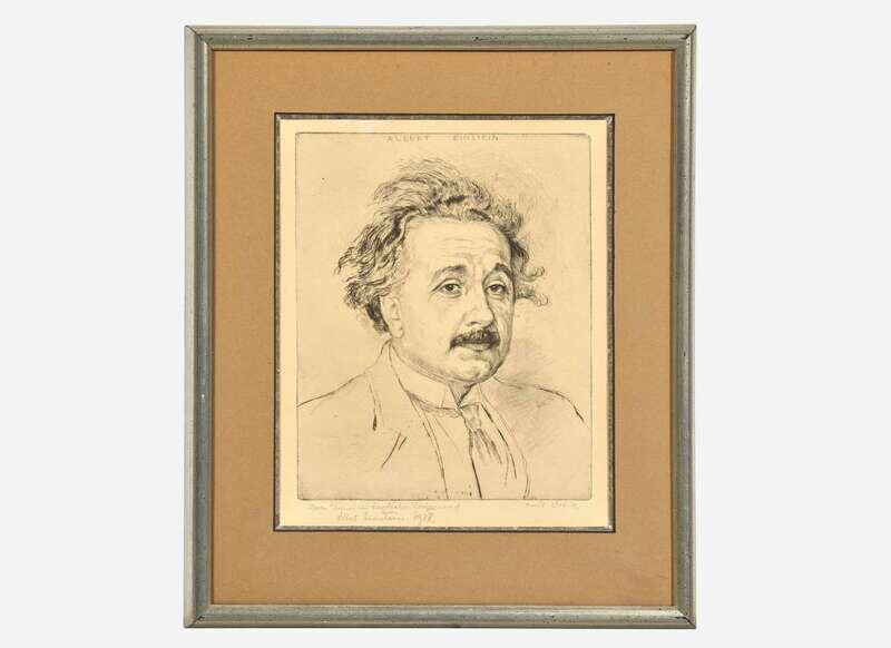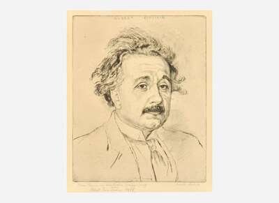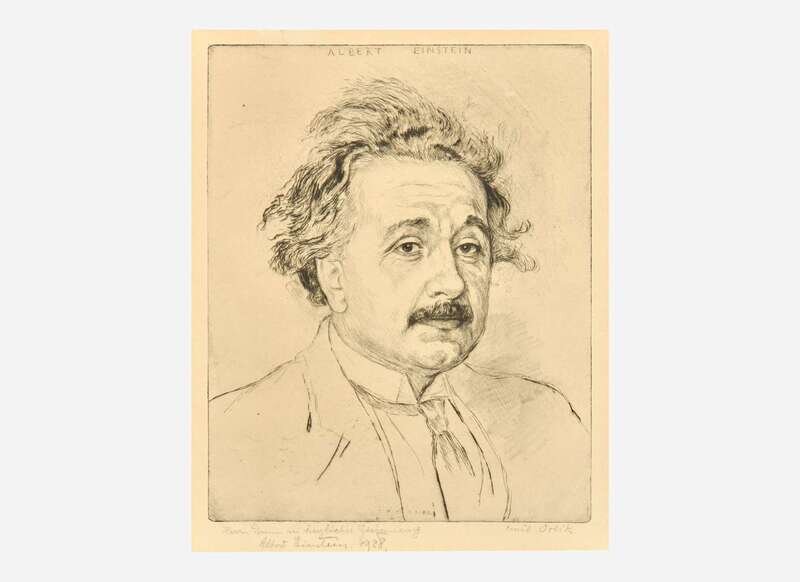 A rare portrait of Albert Einstein by Prague-born artist and printmaker Emil Orlik, inscribed by the famous scientist.