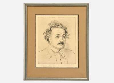 (Berlin, 1928). Etching with drypoint. Inscribed in pencil by Einstein in German below image, “Herr _______ en herlicher g_____ Albert Einstein, 1928.”; signed by Orlik in pencil in bottom right. Mat burn; offsetting from tape mounts; wear along top edge. In mat and in frame, 16 x 13 1/2 in. (406 x 343 mm).
