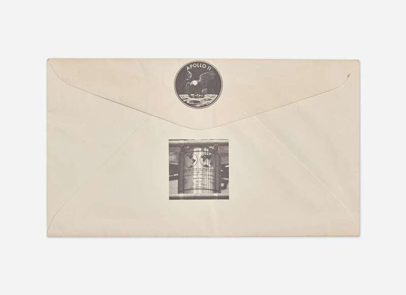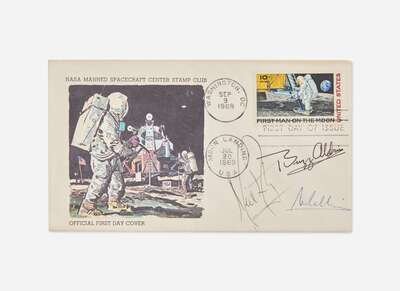 Washington, D.C., September 9, 1969. First day issue postal cover, signed by the three astronauts of the Apollo II moon landing: Neil Armstrong, Buzz Aldrin, and Michael Collins. With NASA Manned Spacecraft Center Stamp Club cachet; “Moon Landing Jul 20 1969” postmark, and 10¢ "First Man on the Moon" postage stamp (Scott #C76). Lightly creased. 4 x 6 1/2 in. (102 x 165 mm). From the collection of former Governor of Texas and Secretary of the Treasury, John B. Connally, Jr.