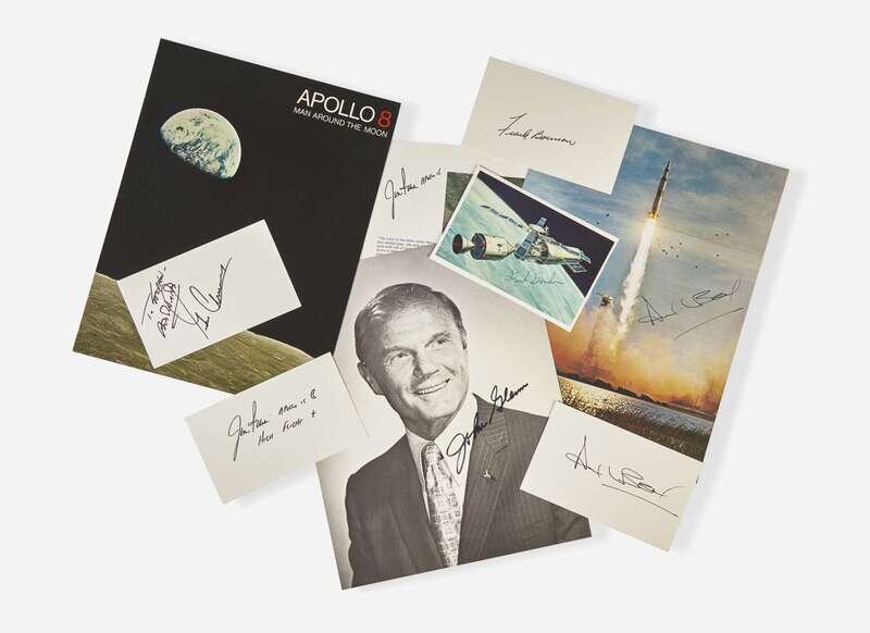 No place, no date. Group of eight signed items, by Frank Borman, Apollo 8 Commander (signature on card); Gene Cernan, Apollo 17 (inscribed on index card); Dick Gordon, Gemini 11 and Apollo 12 (signed on clipped magazine leaf); John Glenn, first American to orbit the Earth (signed photograph); two by Jim Irwin, Apollo 15, eighth man to walk on the moon (inscribed on card and signed on magazine leaf); two by Alan Bean, Apollo 12, fourth man to walk on the moon (signed on card and on magazine leaf). Includes printed brochure Apollo 8 Man Around the Moon (Washington, D.C.: U.S. Government Printing Office, 1968).