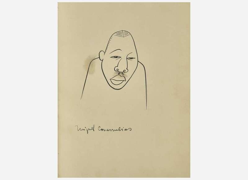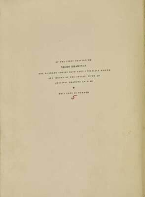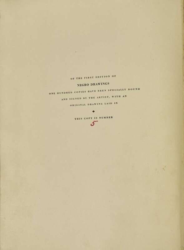 New York and London: Alfred A. Knopf, 1927. First and limited edition, #5/100 copies signed by Covarrubias and with an original drawing by him. 4to. Introduction by Frank Crowninshield. Illustrated with color frontispiece and 56 numbered black and white or color plates, after drawings by Covarrubias. Publisher's quarter black cloth over blue cloth-covered boards, stamped in gilt, corners and extremities rubbed, spine ends lightly worn, boards lightly and unevenly darkened; top edge gilt; text block slipping; front and rear hinges lightly worn; light smudging to original drawing; scattered very light soiling to text and plates; slip case wanting.