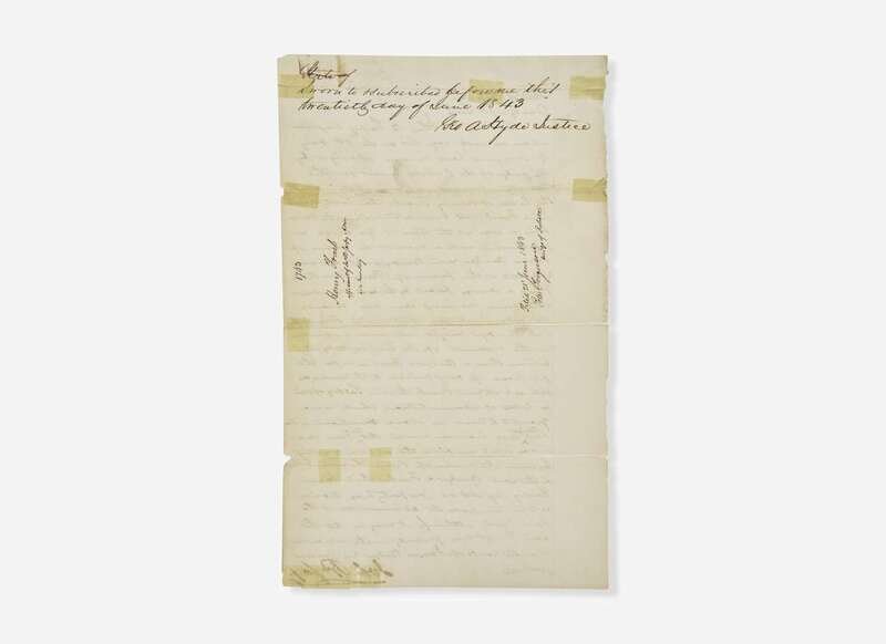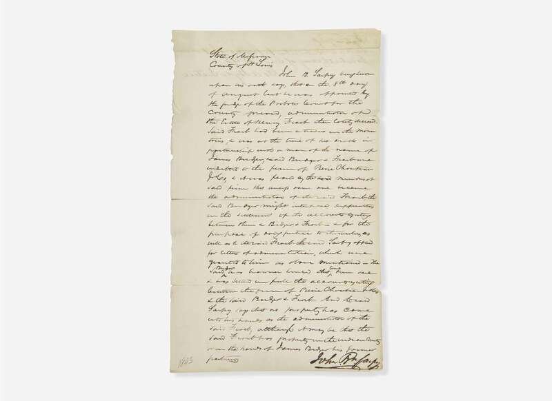 St. Louis, Missouri, June 20, 1843. Single sheet, 12 3/4 x 7 7/8 in. (324 x 200 mm). One-page manuscript document, signed by fur trade magnate John B. Sarpy, being an affidavit testifying about his actions on behalf of the estate of fellow fur trader Henry Fraeb; manuscript on verso by court justice George A. Hyde, docketing to same by probate judge Peter Ferguson. Creasing from old folds, separations along same; tape repairs on verso.