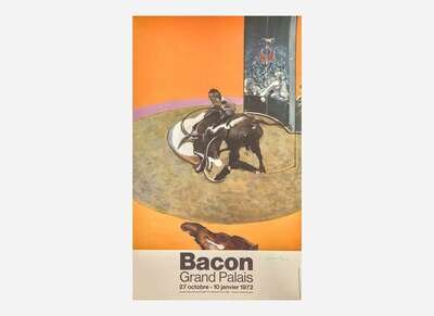 A fine, signed exhibition poster for Francis Bacon's landmark retrospective at the Musée du Grand Palais, Paris, held from October 27, 1971-January 10, 1972. Depicting his Study for Bullfight No. 1 (1969).