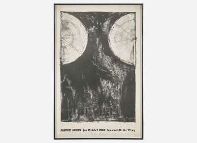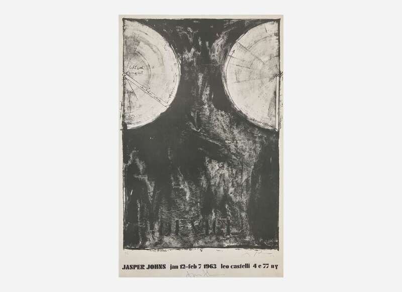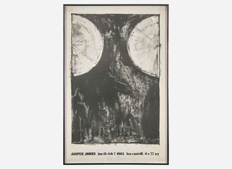 New York, 1963. Offset lithographic exhibition poster, signed by Jasper Johns at bottom; printed on verso, “leo castelli 4 e 77 ny 21”. 31 7/8 x 21 in. (810 x 533 mm) (sight). Soiling along edges; creasing in top left quadrant; corners repaired on verso, soiling and abrasions along edges of same. In frame, 32 1/4 x 21 1/4 in. (819 x 540 mm).