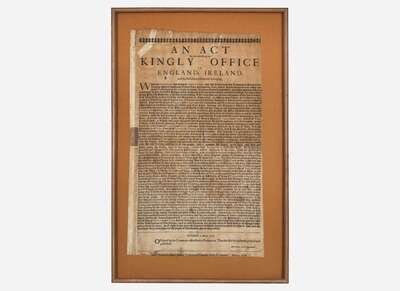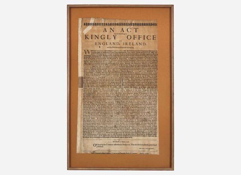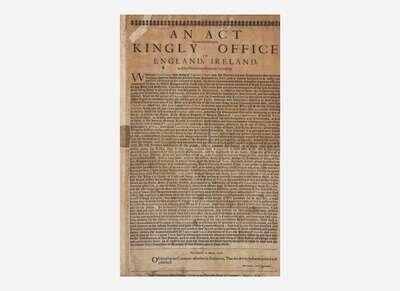Passed by Parliament less than three months after the execution of King Charles I, this broadside prints the Act for the Abolishing the Kingly Office which prohibited Charles's sons--and any future descendants--from inheriting or proclaiming the British Crown. The Act declares the monarchy “unnecessary, burthensome and dangerous to the liberty, safety and publique interest of the people”, stating that it was only used “to oppress, and impoverish and enslave the subject.” With the end of the monarchy the Act establishes the Commonwealth--a return to the English people's “just & ancient right, of being governed by its own Representatives or National meetings in Councel…chosen & entrusted for that purpose by the people…"