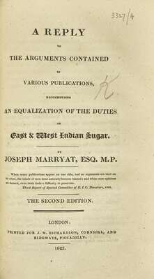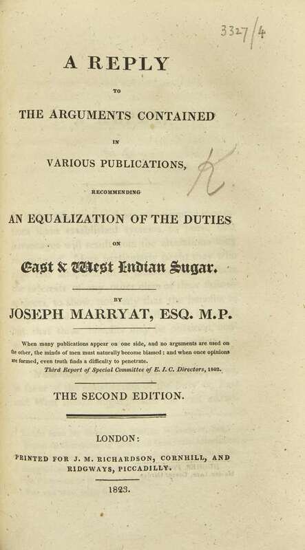 4. Marryat, Joseph. A Reply to the Arguments Contained in Various Publications, Recommending an Equalization of the Duties on East & West Indian Sugar. London: Printed for J.M. Richardson and Ridgways, 1823. Second edition. 111 pp.; with half-title. Sabin 44708