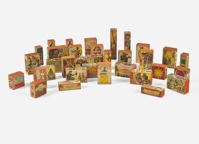 New York: J. H. (Singer Company), (ca. 1870s-80s). Original wooden box with illustrated cover paper label on lid, with 33 (of 34) wooden blocks of various sizes, each with a different illustrated paper label on four sides; missing block supplied with a period example from another game. Wear and soiling to box lid, lid split and repaired on verso, chipping and small losses to cover label, loss at bottom of lid and lower rim of top of box; paper labels on blocks rubbed and worn, with some loss, with scattered loss; contemporary inscription in pencil on bottom of box. OCLC 78763494