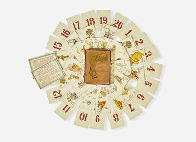 New York: Published by Selchow & Righter, 1882. Comprising 52 color lithographic playing cards, divided into three numbered groups (two sets of 16 and one set of 20); 32 cards illustrated with characters from the book (based on John Tenniel’s original designs), 20 with numbers only. Set includes two printed rules cards. Lightly worn; card 2 in first set worn from damp, with pencil correction in top left corner; old pencil numbering in top left corner of each card in third set. In original red card box with illustrated paper cover label, rubbed and worn, tape repairs on lid corners, contemporary gift inscription on verso of same. OCLC 33064181