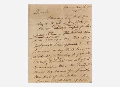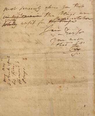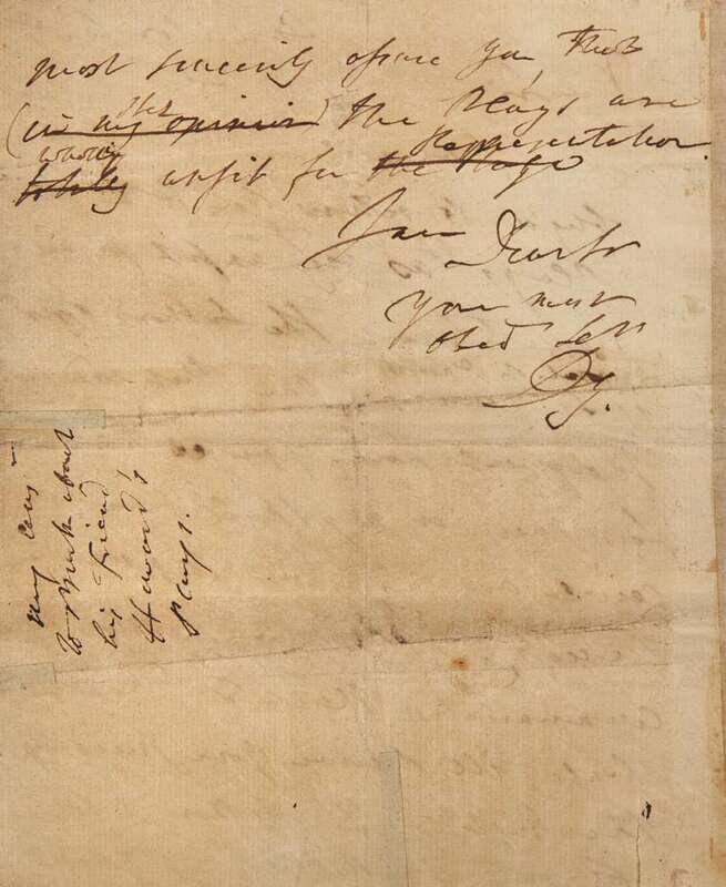 Although Garrick picked up on the irony in Burke’s words (that letter is docketed “An ironical letter of Burke's”), his reply--of which this copy is a draft--is entirely serious and scathing, as can be seen in his crossing out of his summation of them as “totally unfit for the Stage,” and changing it to the even more devastating, “wholly unfit for Representation.”