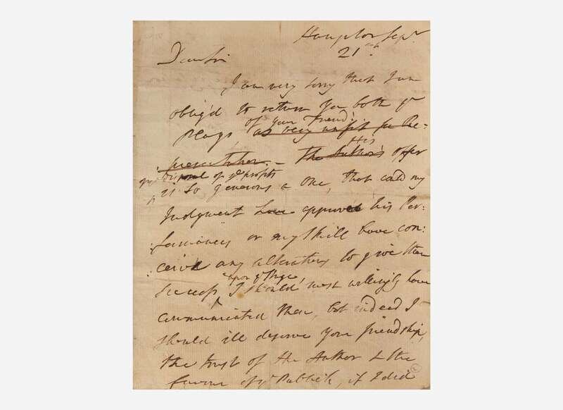 Hampton, (London), Sept(ember) 21, (1772). One sheet, 8 x 6 1/2 in. (203 x 165 mm). Draft autograph letter, signed by David Garrick to Edmund Burke, rejecting plays written by Burke's friend, Gorges Edmond Howard (bracketed sections crossed out): “Dear Sir I am very sorry that I am oblig’d to return you both ye plays of your friend [as being unfit for representation—The Author’s] His offer ___ disposal of ye profits is so generous a one, that could my Judgement have approved his Performances or my skill have conceiv’d any alteration to give them success upon ye stage, I should most willingly have communicated them, but indeed I should ill deserve your friendship, the trust of the Author & the favour of ye Publick, if I did most sincerely ____ you, that his [(in my opinion)] the plays are wholly [totally] unfit for [the Stage] Representation I am Dear Sir Your most Obedt Serv D.G.” Creasing from old folds; docketed on verso in an unknown hand, “…To Burke about his Friend Howard’s Plays.” Tipped into gilt stamped cloth chemise, with engraved portrait of Garrick, as well as a typed transcription of the letter.