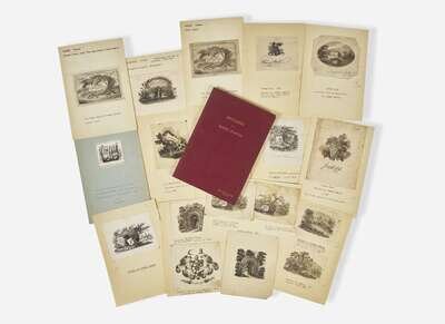 Places and dates vary. Collection of 17 engraved book-plates: 11 featuring designs by English engraver Thomas Bewick; three from the library of English bookbinder and sportsman Thomas Gosden; one from the library of Izaak Walton bibliographer Thomas Satchell; and two others. Sizes vary. Most mounted to larger sheets with printed labels or descriptions. Condition varies, generally fine. All housed within a custom red cloth chemise, stamped in gilt “Brooke Dolan 1940” on front panel. Lot also includes A Catalogue of an Exhibition of Angling Book Plates forming the collection of Daniel B. Fearing, Newport, R.I. From the sporting library of American adventurer, naturalist, and sportsman, Brooke Dolan II.