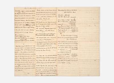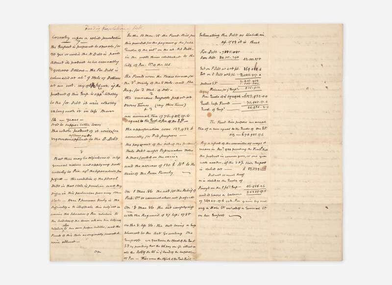 No place, no date (presumably ca. 1786 or after). Single sheet, 12 7/8 x 16 in. (327 x 406 mm). Lengthy two-page autograph document, presumably in the hand of Rufus King; titled in another, likely later, hand, “Funding a Debt Notes of Speech” and “Funding Revolutionary Debt”. Written in four columns per side; on J. Coles Britannia water-marked paper. Creasing from old folds; scattered ink smudging; uneven offsetting on first page.