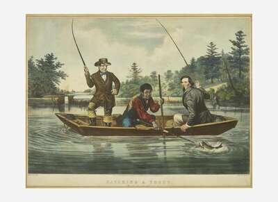 A handsome hand-colored lithograph of this fishing scene, showing three men catching trout near Tuxedo, New York.