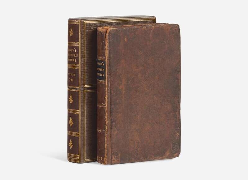 London: Printed for the Author. To be sold by Henry Mortclock, 1694. First edition. 8vo. xxxix, (i), 304 pp. From the sporting library of American adventurer, naturalist, and sportsman, Brooke Dolan II. Full contemporary brown calf, stamped in blind, rebacked, black morocco spine label, stamped in gilt, extremities and boards rubbed and worn; all edges trimmed; book-plate of angling collector Edwin F. Snow on front paste-down; ownership signature, dated 1766 on front blank, old lengthy inscription below same, “of extreme rarity…”; scattered light spotting to text; very small loss in top corner pp. 221/222; in brown straight-grain morocco lift-off case. Westwood & Satchell, p.100