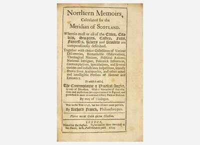 Rare first edition of Richard Franck's part travel-memoir, part angling discourse, containing “curious particulars about the state of Scotland” (Walter Scott in the 1821 reprint). The book’s “main interest centers in the places which Franck visited in Scotland, and the account of them which he gives. His route was by Carlisle and Dumfries to Glasgow; thence to Stirling, Perth, Forfar, and Loch Ness; Sutherlandshire and Caithness, Cromarty, Aberdeen, Dundee, St. Andrews, Edinburgh, and Berwick, were next seen, and he made his way home by Morpeth. For anglers the book possesses great attraction. Franck is the first to describe salmon-fishing in Scotland, and both in that and trout-fishing with artificial fly he proves himself an excellent practical angler. His rules for fly-fishing, and especially for salmon-fishing, cannot be improved at present. Internal evidence shows that he had read the 'Compleat Angler;' indeed he tells us that he had argued with Walton at Stafford on the fact related by the latter of pickerel weed breeding pike, and that Walton laid it on Gesner and then 'huffed away.' Franck loses no opportunity of scoffing at him. He incidentally mentions Nottingham as being even in his time the nursery of many good anglers, describes their famous 'pith bait' and the breeding of salmon, and commends the dressing of a fly which could not be improved upon at the present day. He is the first angler to name that curious fish of the Trent, the burbot, and highly commends the salmon of the Thames, especially those caught below bridge.” (DNB)
