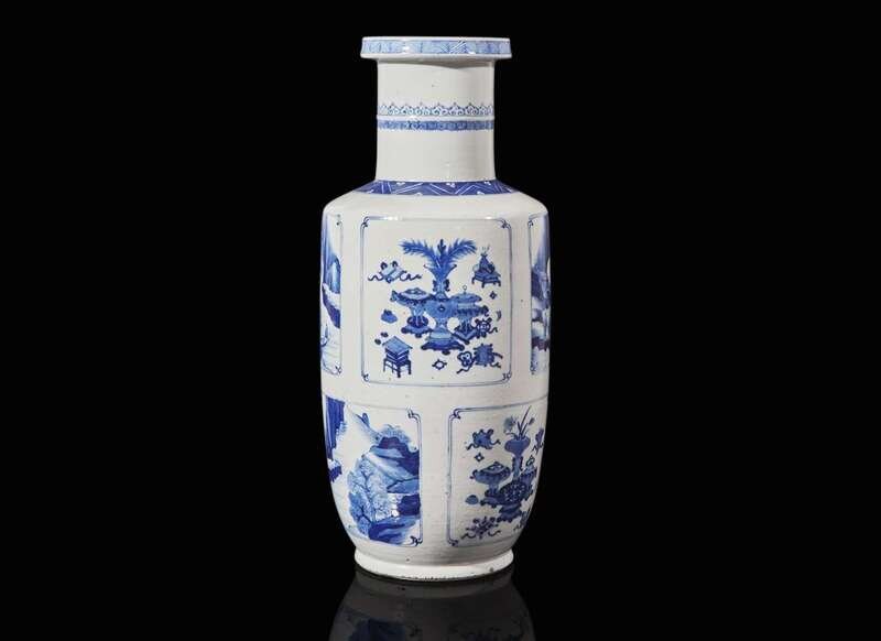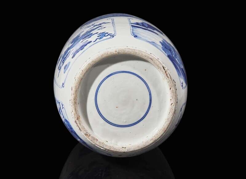 The main body decorated with multiple cartouches of various subjects depicting landscapes and antiques, the neck with a stylized ruyi-head band, the underside bears an underglaze blue double circle