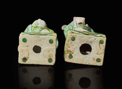 Depicting Han Xianzi with his flute, and Lu Dongbin with sword and fly wisk; both on rectangular bases