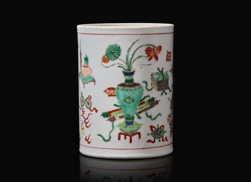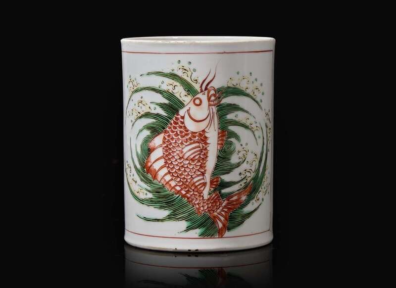 One side decorated with a leaping carp, the other side with antiquities and auspicious Buddhist emblems