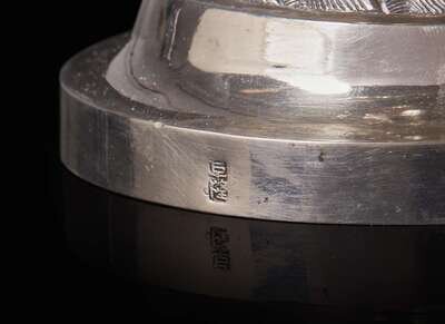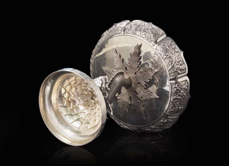 The shallow circular paneled dish with barbed rim, each panel with repousse auspicious fruits and flowers, over a serpentine “Dragon-fish” standard, the domed base chased with stylized waves, maker's mark for Fu Long to side of base; approx. 19.58 ounces troy