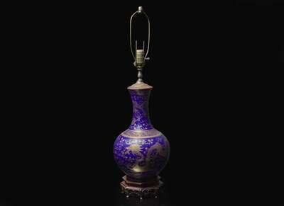 Now mounted as lamp, the upper and lower register decorated with gilt dragons chasing a flaming pearl, separated by a band of "Shou" characters amidst floral and foliage.