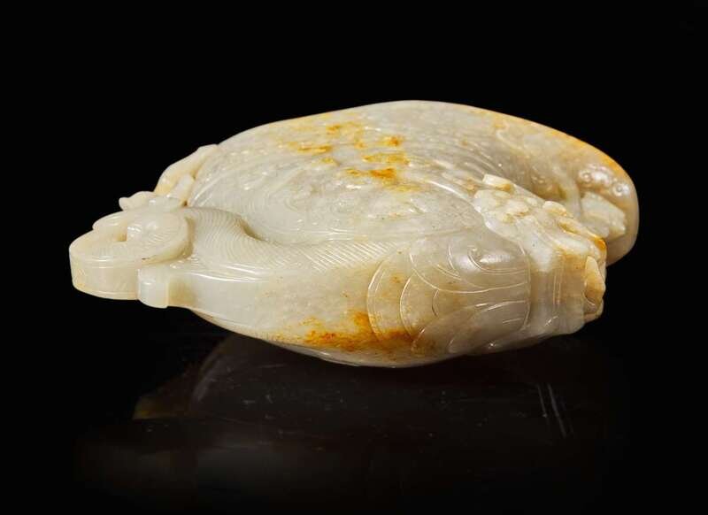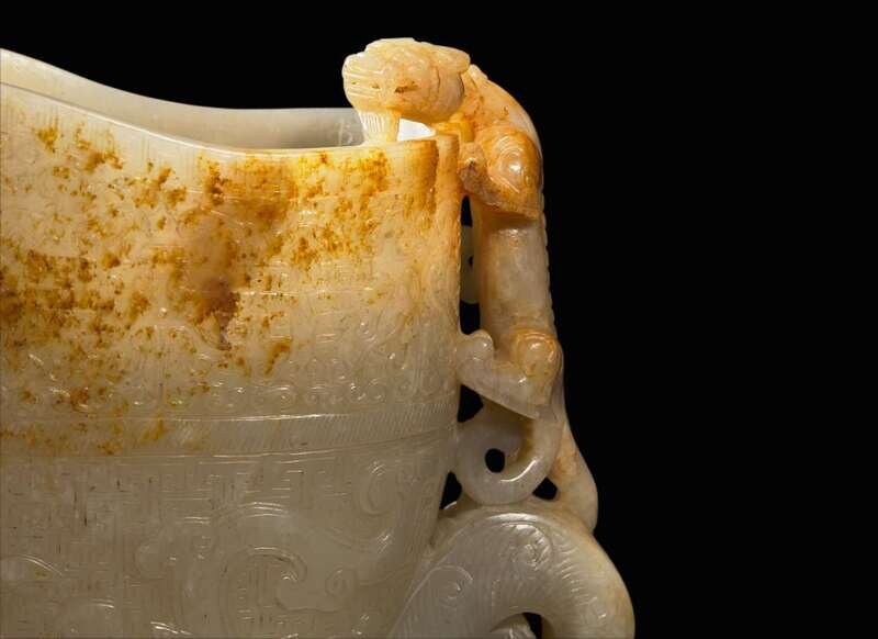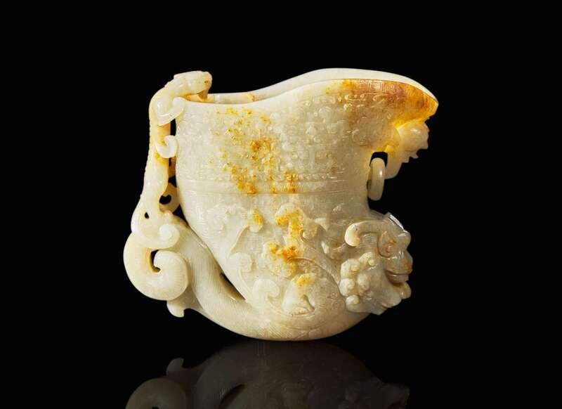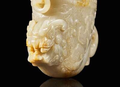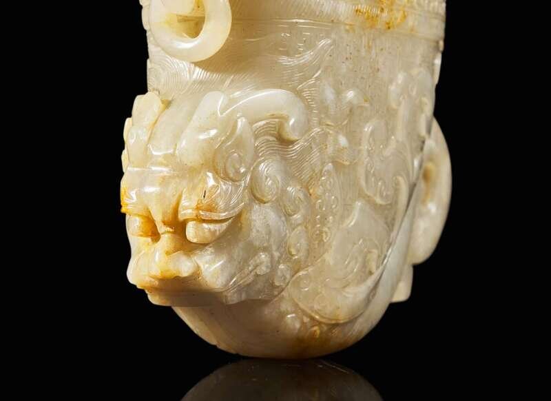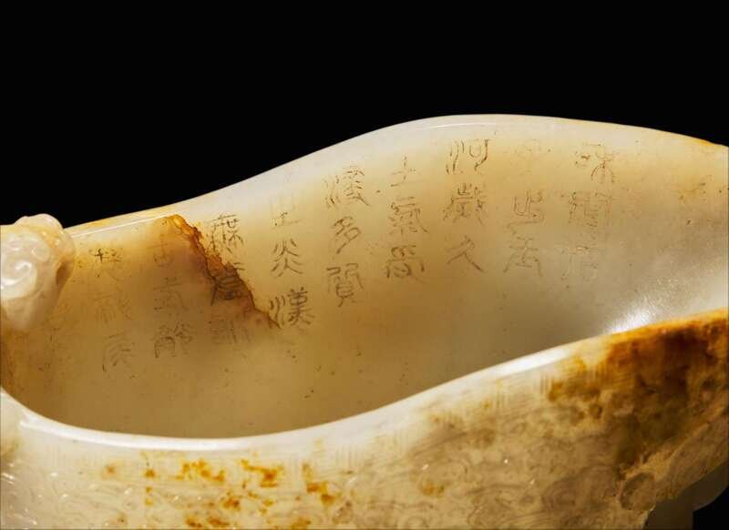 Elaborately-carved and well-polished, the exterior carved in high relief with archaistic scrolls against low relief fret-patterned ground, a phoenix spreading its wings beneath the spout, with a suspended ring, the handle intricately carved as a Qilong clambering over the rim, all above a dragon base, all finely-detailed; the interior of the mouth inscribed with an imperial poem by the Qianlong emperor, “Hetian yu longwei gong ge” (Song for a Hetian Jade Dragon Tail Rhyton) 《和闐玉龍尾觥歌》in bronze-script characters