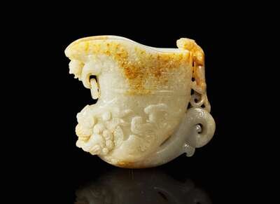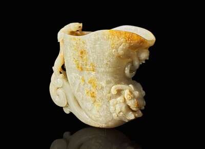A large Chinese carved pale celadon and russet jade rhyton vessel 青白玉雕觥杯