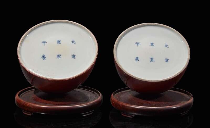 A pair of Chinese iron-red enameled water coupes with hardwood bases 礬紅太白尊一對及木座