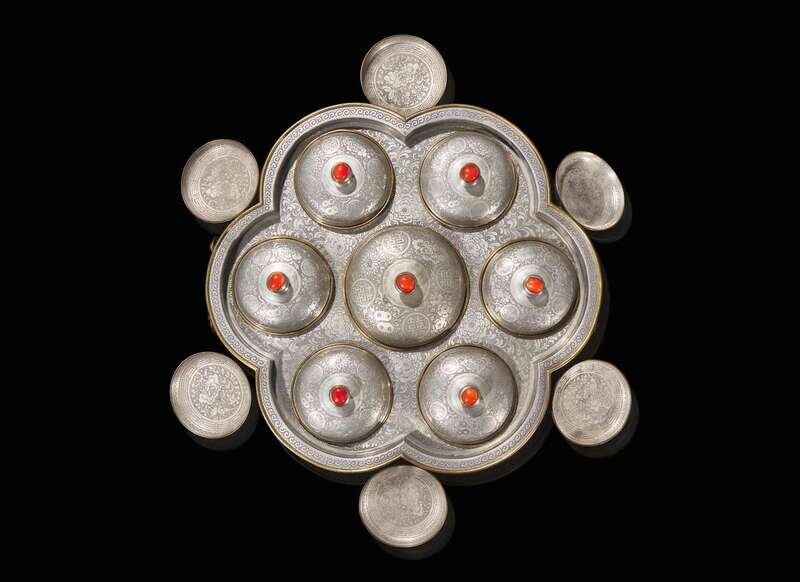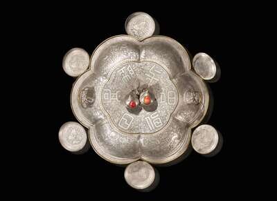 The large six-lobed pewter case enclosing seven smaller covered dishes, all covers embellished by hard stone finials, the surface depicting animal subject reserves, a pair of beast head bail handles on cover and sides, a peach-spray finial to the cover, all accompanied by six dishes to the sides, all raised on open bracket foot, three seal impression to underside of cover, “Dian Tong”, “Yang Cheng, Shui Mu Wan, Zhou Sheng He”, and “Jing Xi”.