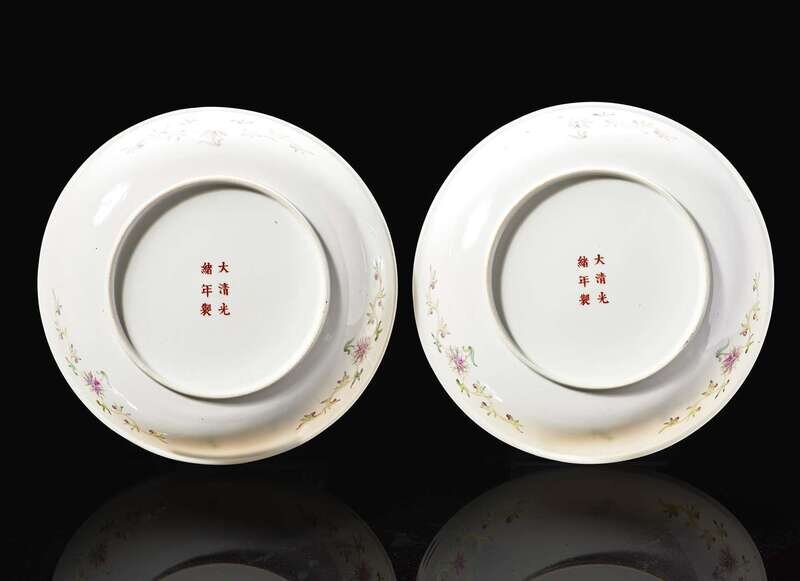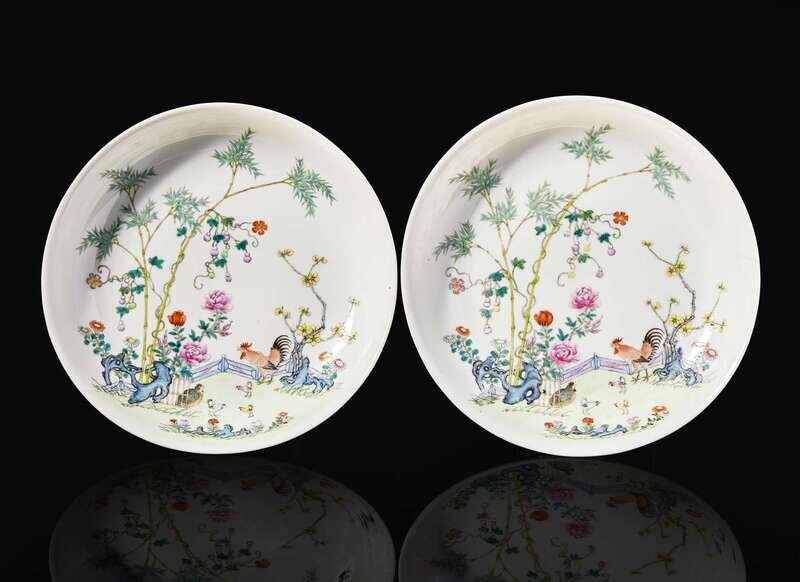 A pair of Chinese famille rose "Cockerel" dishes, Guangxu six-character marks, possibly Republic period 粉彩錦雉盤一對 可能為民國