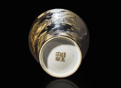 The body incised with figures at various pursuits in an extensive river landscape, heightened with gold, underside with four-character incised mark.