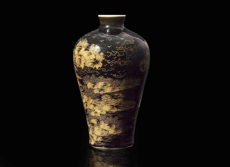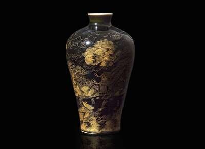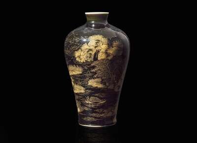 A gilt-incised black monochrome "Landscape" vase, meiping, incised four-character Chuxiu Gong zhi mark 黑地描金刻劃山水梅瓶 儲秀宮四字款