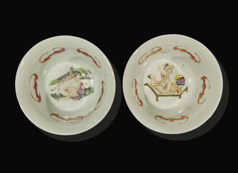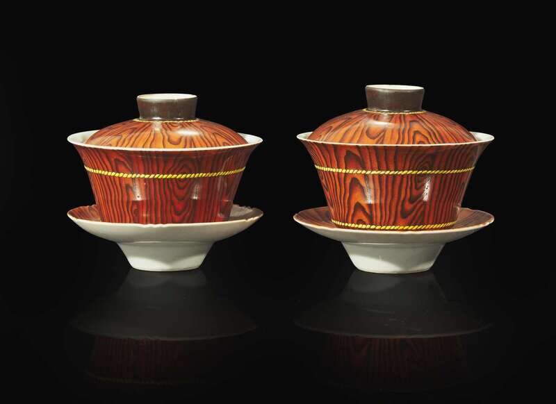 A pair of Chinese faux bois porcelain erotic tea bowls, covers, and stands 仿木紋春宮茶盞兩套