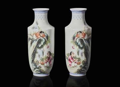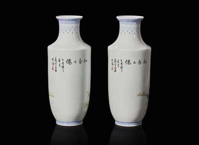A pair of famille rose-decorated porcelain vases, Republic period 粉彩"和合二仙"瓶一對 民國