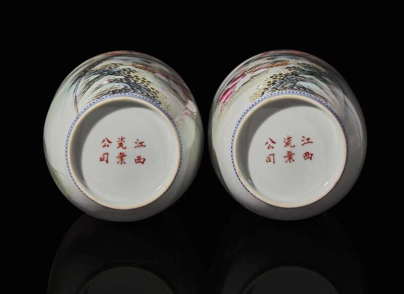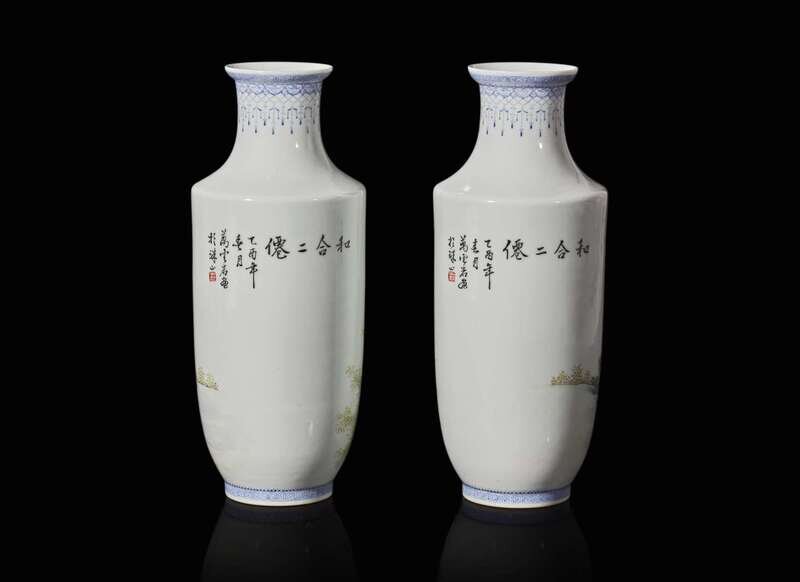 Both decorated with the Hehe Erxian in rich palette, graceful blue-enameled borders to both rim and foot ring, inscription with mark and dated to the cyclical year "yiyou", equivalent to 1945, "Jiangxi ciye gongsi" (Jiangxi Porcelain Co) mark to the underside. H: 11 3/8 in.
