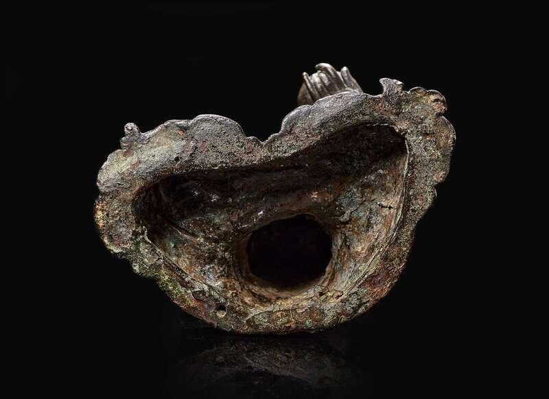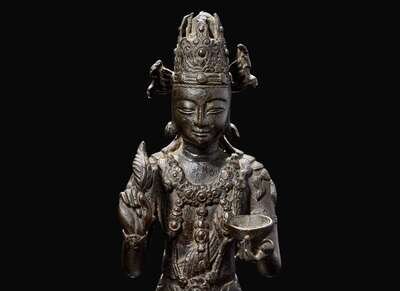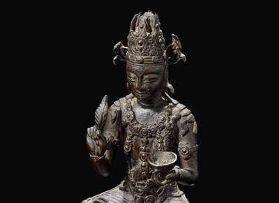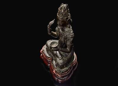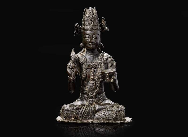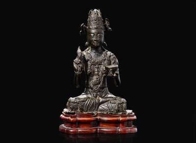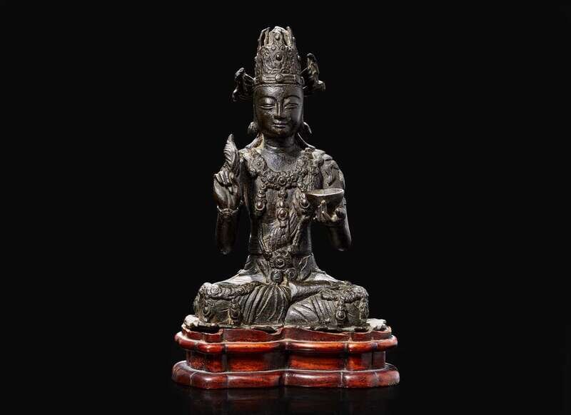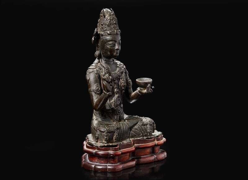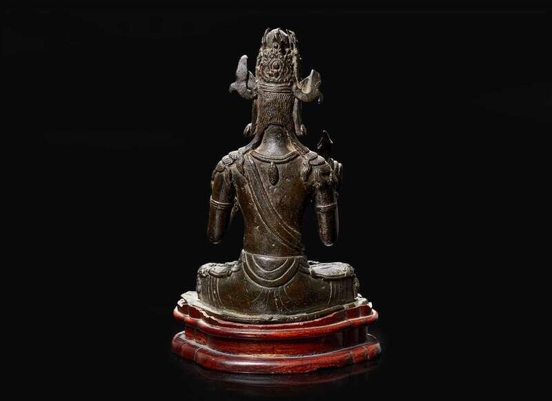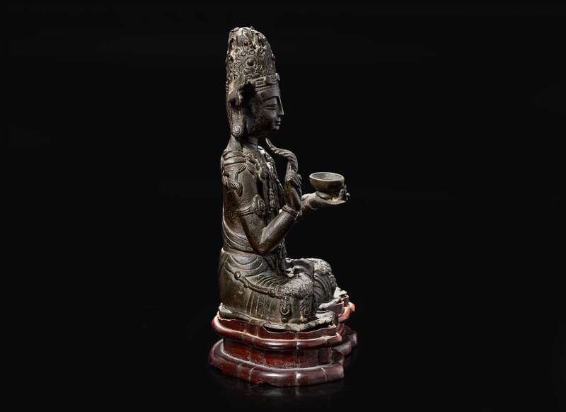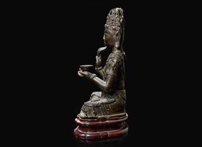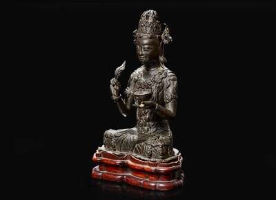 A rare Chinese patinated bronze figure of Guanyin, Yunnan, 12th to 14th century 珍罕銅加漆觀音像及底座 雲南大理 十二至十四世紀