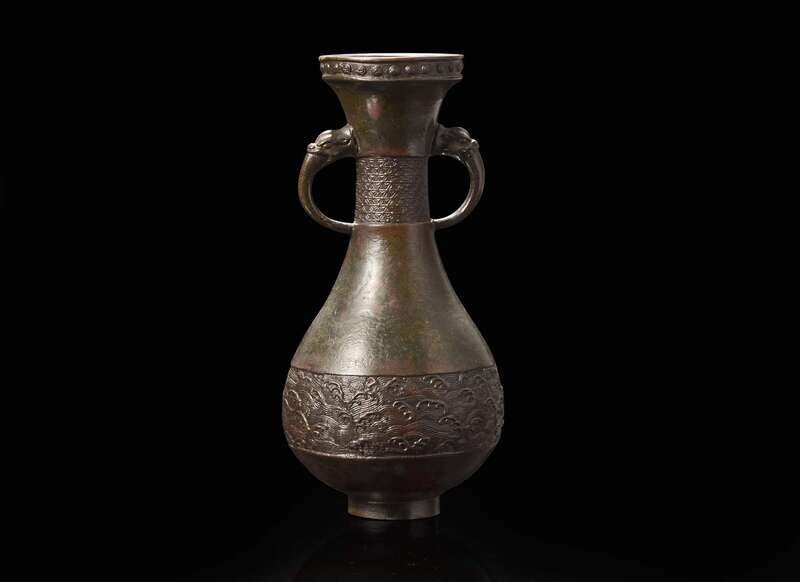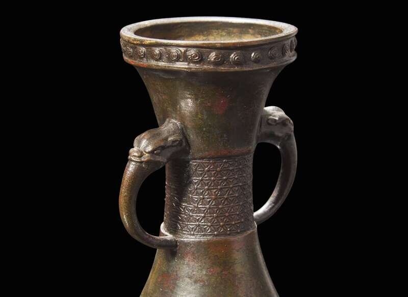 The vase decorated with two beast handles, “brocade”-patterned neck, a band of waves to the lower register, bosses encircling the rim, dark red-brown patina