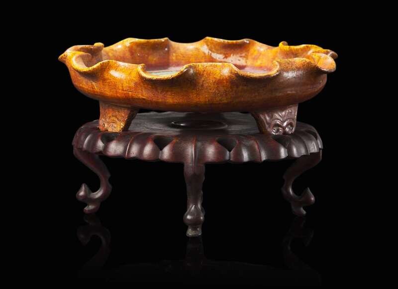 The lobed dish potted with an unusual ruffled rim, decorated with a border of green-glazed ruyi-heads, enclosing a yellow field centered by blue floret; the remainder with amber glaze, the feet with scroll motifs, later wood stand.