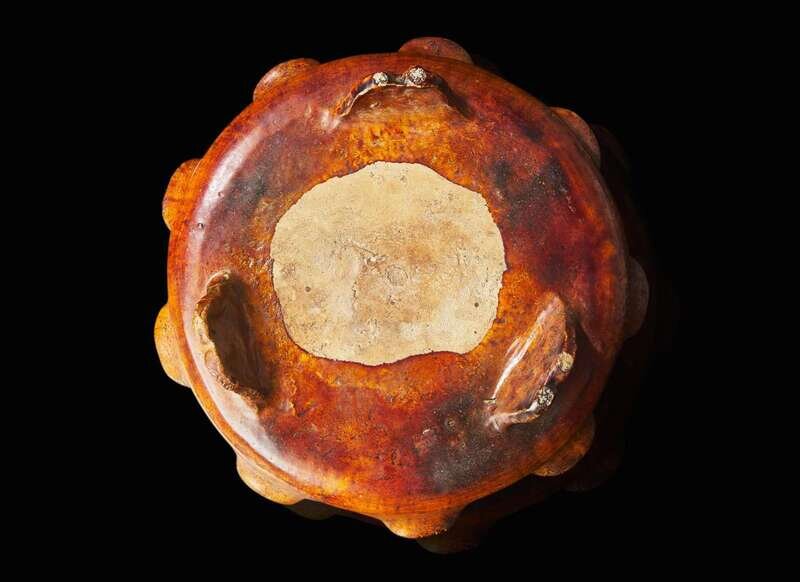 A Chinese sancai-glazed tripod dish with wood stand, possibly Ming dynasty 三彩三足盤帶底座 可能為明