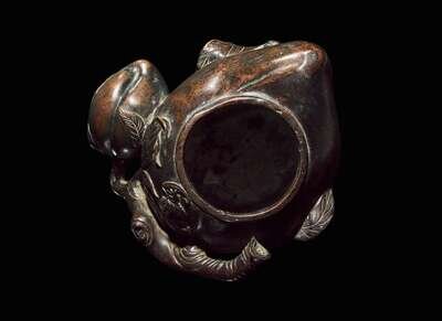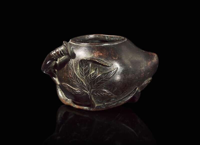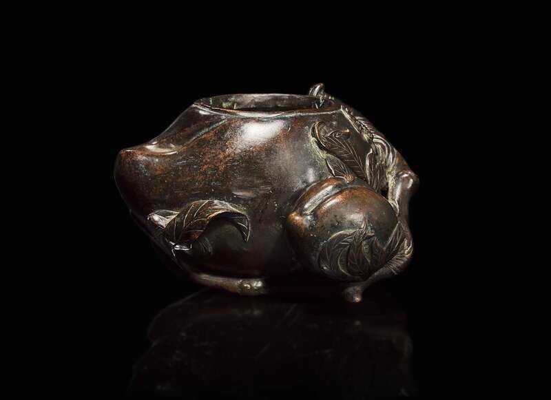 A Chinese patinated bronze peach-form coupe, Qing dynasty, 18th/19th century 銅加漆桃形水丞 清 十八至十九世紀