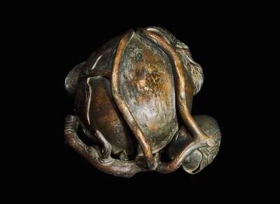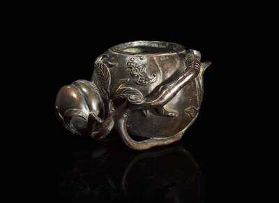 Modeled in the form of a large and a small peach on a leafy stem, a stylized bat below the rim; dark brown patina