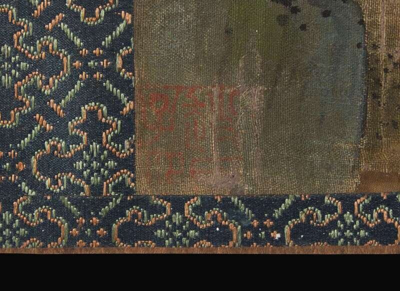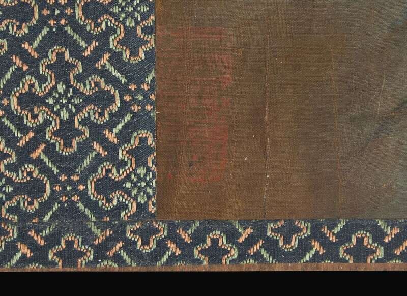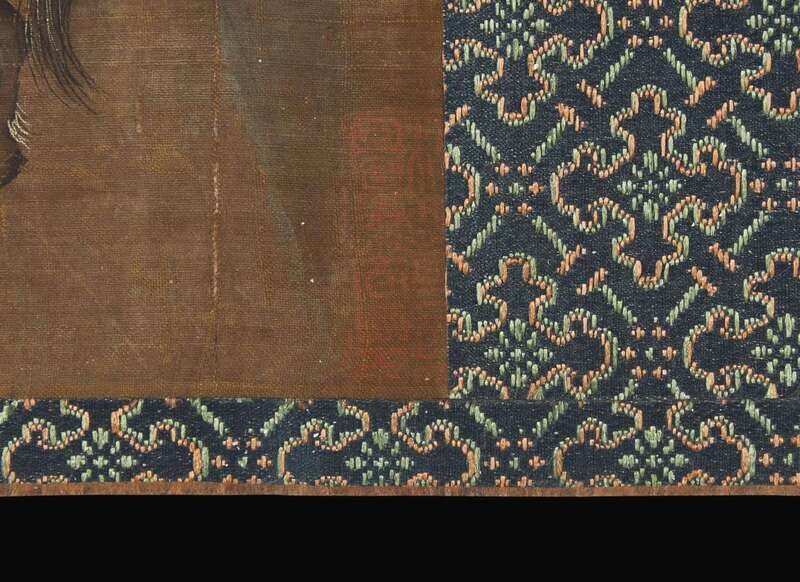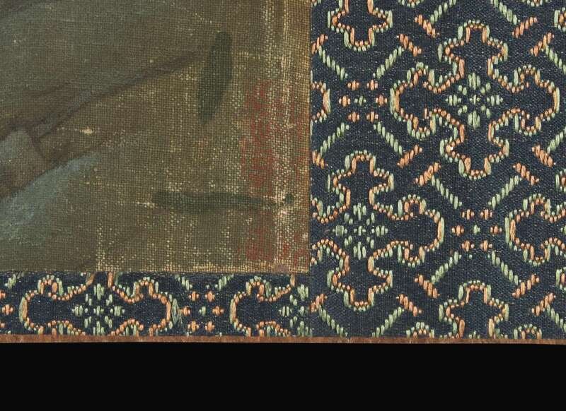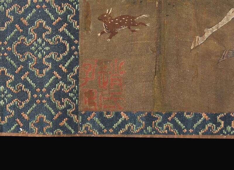 Ink and color on silk, one with one seal lower left, another seal lower right, other scene with three seals: one seal to lower right, another to upper right and the third to lower left corners; Japanese wood box.