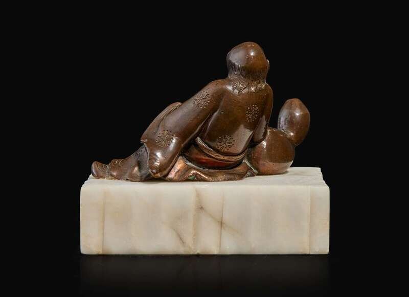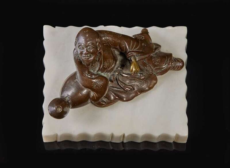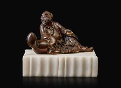 A patinated bronze figural brush rest 太白醉酒銅筆架