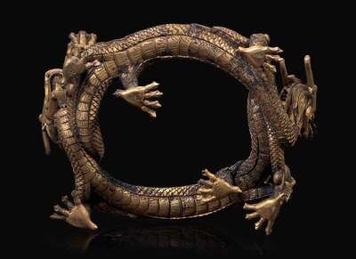 The circular stand modeled in the form of a pair of fierce serpentine open-mouthed five-clawed dragons, each clutching a jewel in the talons of a front leg, well-detailed with crisp scales