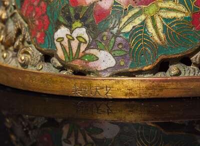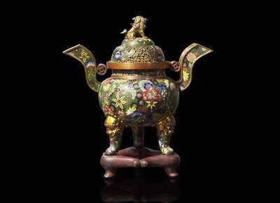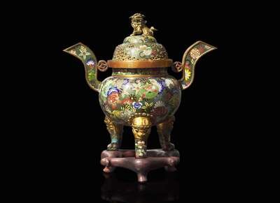 A Chinese cloisonne censer and cover with wood stand, Lao Tian Li, Late Qing to Republic period 景泰藍帶蓋香爐配底座 老天利製 晚清至民國