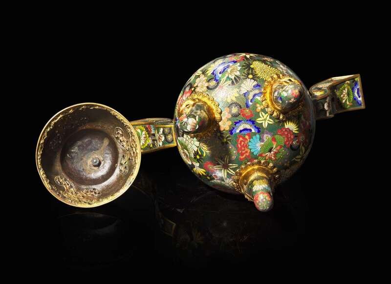The pierced domed cover with Buddhist lion finial, over a bulbous body with flared handles, raised on three cabriole legs issuing from beast masks, dense and colorful floral ground, the edge of the cover engraved “Lao Tian Li Zhi”; wood stand