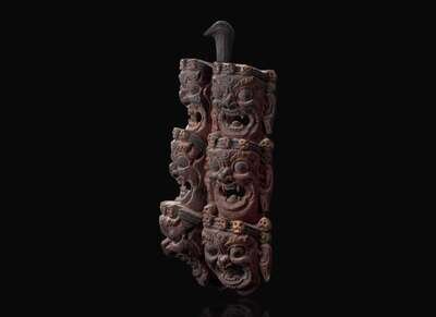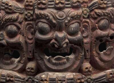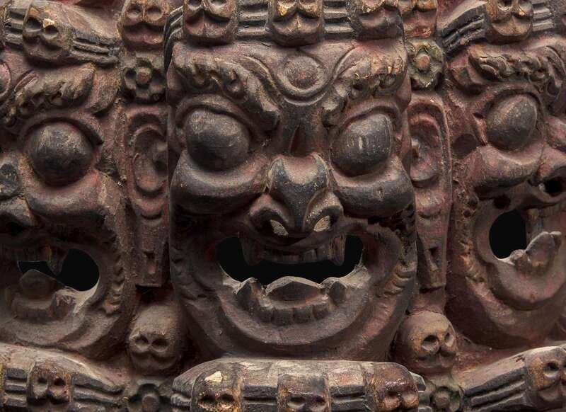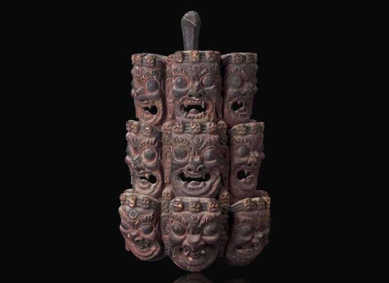 Depicting nine fierce faces with skull diadems, surmounted by a bird's head