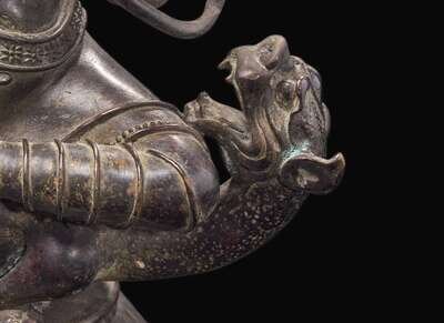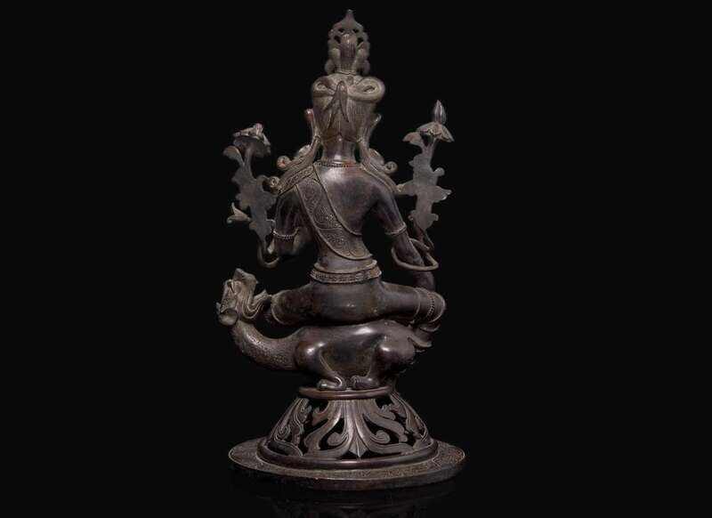 The graceful seated figure flanked by stylized lotus, atop a mythical beast on domed openwork stand, the border of the stand incised with floral scrolls